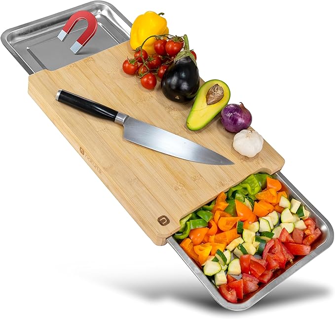 Ein Schneidebrett mit magnetischen Auffangschalen – rechts das Geschnittene, links die Abfälle. Andersrum geht natürlich auch.